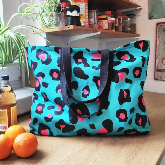 SHOPPER TASCHE: Leo Print In Schwarz/Rosa Auf Türkis